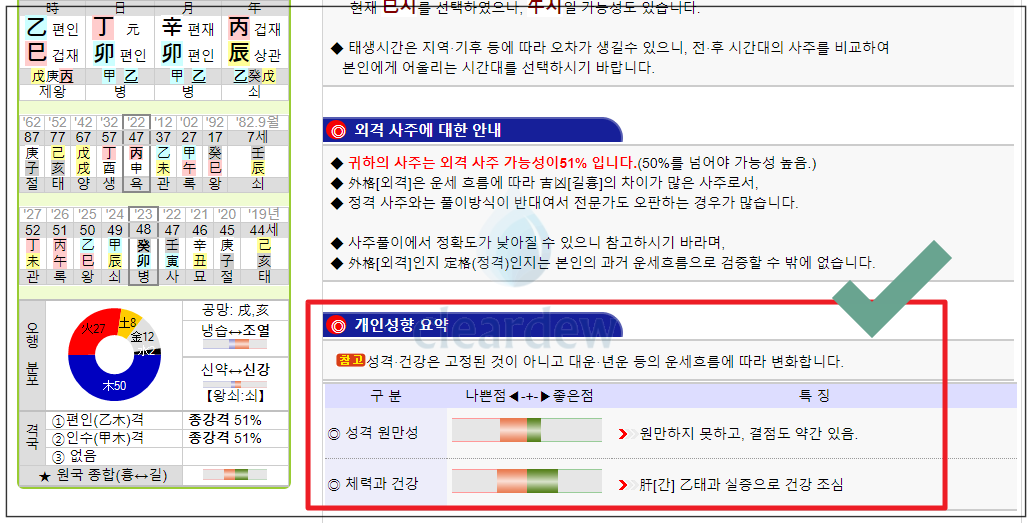 8. 사주 넣기 버튼을 누르면 좌측에는 사주명식표 와 오행분포 등 나타나고, 우측에는 상세한 해석이 나타납니다. 해석을 보면 성격 원만성과 체력, 건강에 대한 내용을 살펴볼 수 있는데요. 특징 부분을 보면 어떤 것을 의미하는지 명확하게 알 수 있습니다.