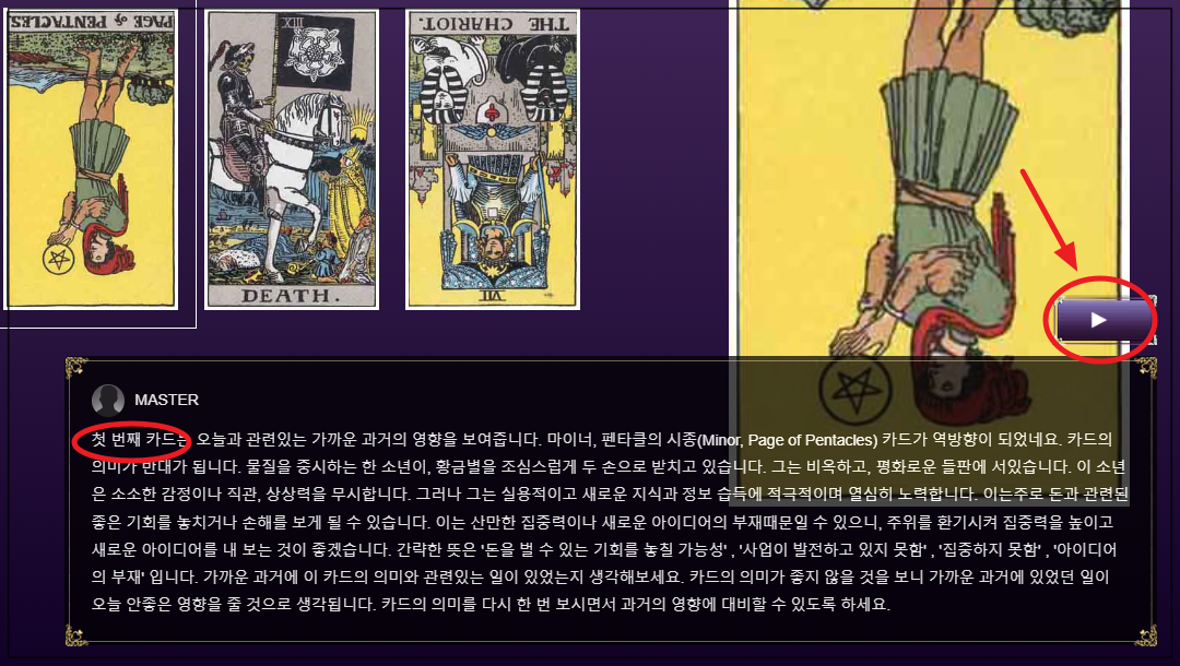 4. 가장 먼저 해야 할 일은 카드를 섞는 일입니다. 오른쪽에 보면 재생 버튼 있는데요. 이 버튼을 누르면 카드 섞기를 시작할 수 있습니다. 정신을 집중해서 해당 버튼을 눌러 주세요.