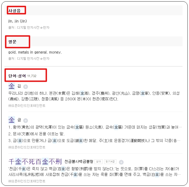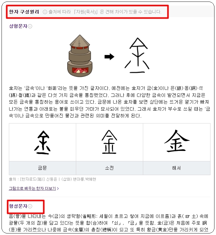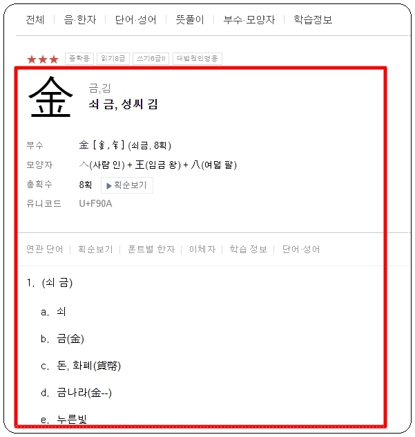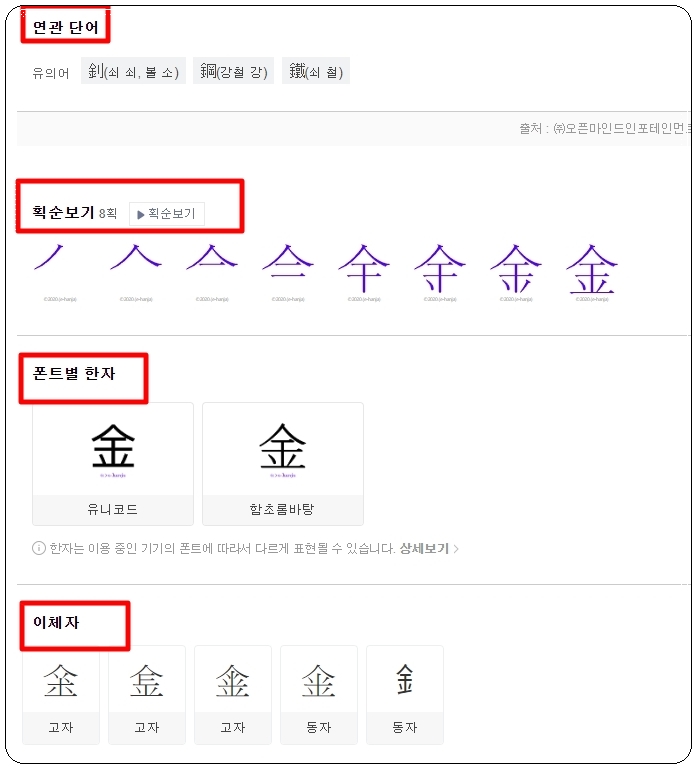 저는 '쇠 금"을 또 한번 선택했는데요. 이와 관련된 여러 가지 한문 사전 정보가 나타났습니다. '쇠 금'에 대한 부수, 모양자, 총획수, 유니코드, 뜻, 연관 단어, 획순, 폰트, 이체자 등 정말 많은 내용을 살펴볼 수 있습니다.
