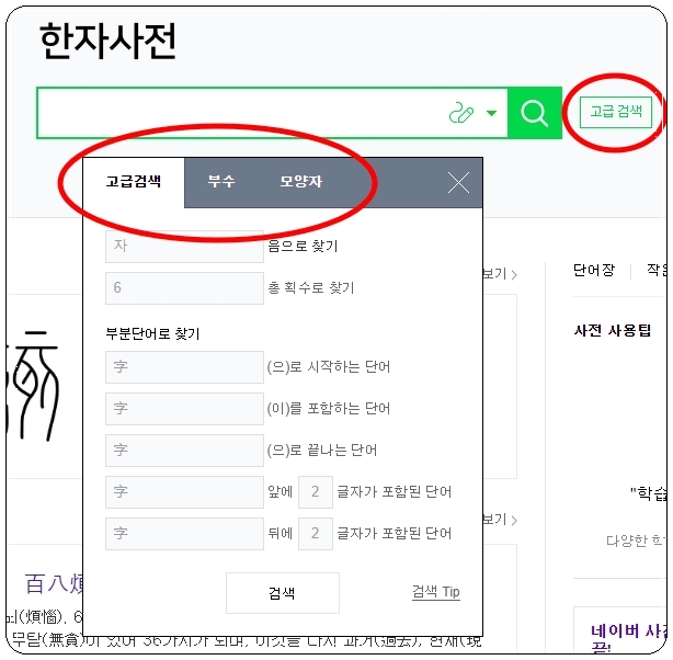 한자 사전 페이지가 열리면 검색창에서 우측에 위치한 필기 모양의 아이콘을 클릭해 보세요. 그럼 마우스로 한자를 그리면 자동으로 인식이 되는 필기 인식기가 나타납니다. 추가적으로 모르는 한자 찾기에 유용한 고급 검색 메뉴를 선택해 보세요. 그럼 음, 총 획수, 부수, 모양자, 부분 단어를 이용하여 모르는 문자를 찾기 가능합니다.