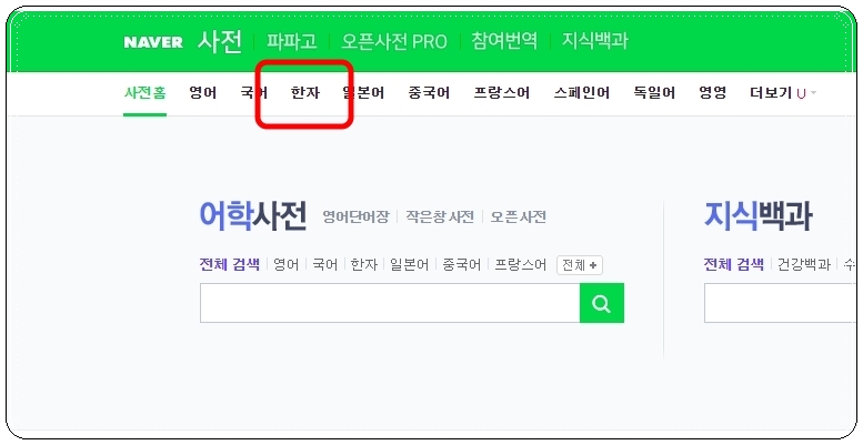 사전 사이트에 접속하면 영어와 국어를 비롯한 여러 가지 사전을 고를 수 있는 메뉴가 나타나는데요. 여기에서 한자를 선택해 주세요.