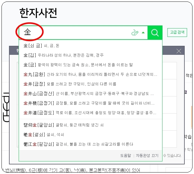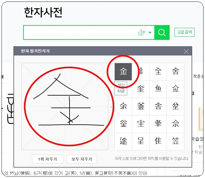 저는 한문 필기 인식기를 이용해 보았습니다. 여기에 '쇠 금'을 그려보았는데요. 모르는 한자의 모양을 여기에 그리자마자 바로 옆에 20개의 유사하게 생긴 한자가 나타납니다. 여기에서 본인이 알아보고자 한 것과 가장 비슷한 것을 선택하면 됩니다. 선택을 한 결과 '쇠 금'의 한자 모양이 검색창에 입력이 되었습니다. 자동으로 완성된 리스트에서 알아보고 싶은 것을 마우스로 클릭해 주세요.