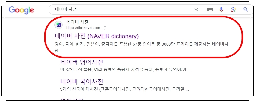 이번 시간에는 네이버에서 제공하는 사전 서비스를 이용하도록 하겠습니다. 검색을 해도 되고, 네이버 포털에서 메뉴를 선택해도 됩니다.