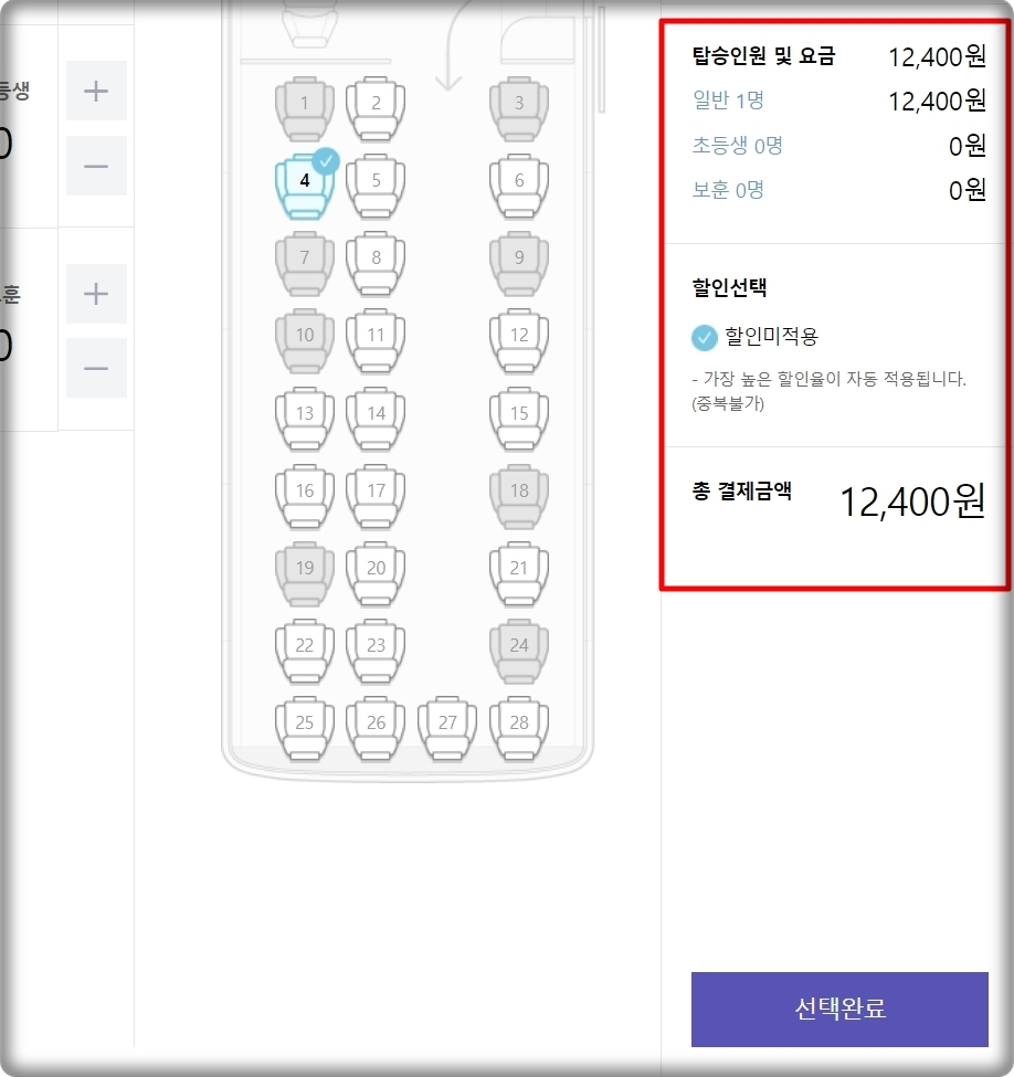 새롭게 열린 페이지에서는 탑승 인원과 탑승할 좌석을 선택할 수 있는데요. 나와 있는 고속버스 좌석을 클릭해 보세요. 그럼 할인 적용 및 미적용된 요금까지 계산돼요 최종 결제 금액이 나타납니다.