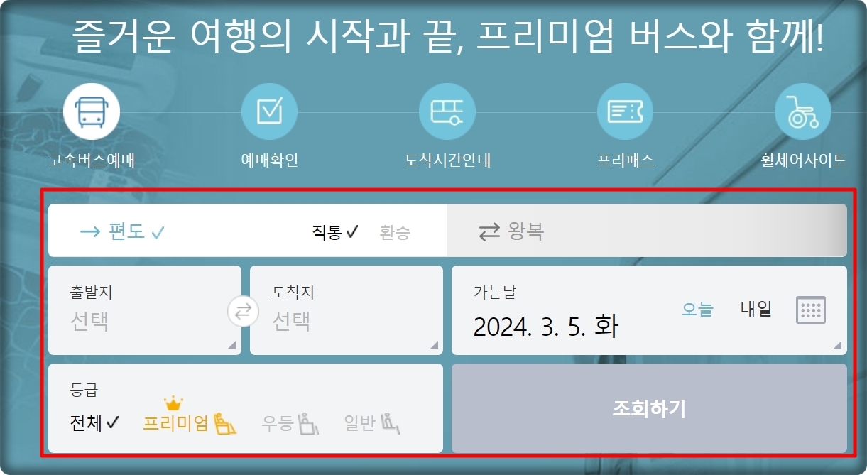 사이트에 접속하면 도착지와 출발지를 입력하는 곳이 나타나는데요. 구매하고자 하는 승차권에 대한 정보를 입력한 후 조회하기 버튼을 누르면 됩니다.