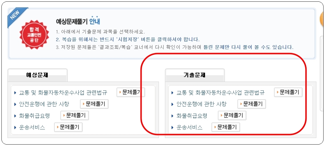 새롭게 열린 웹페이지를 통해 기출문제는 물론이고, 예상문제와 실전문제 그리고 관련 시험자료 등을 제공하고 있는데요. 화물운송자격증 시험에 관련된 동영상 교육을 한 번 정도 시청한 후 "기출문제 풀기" 버튼을 클릭해 주세요.