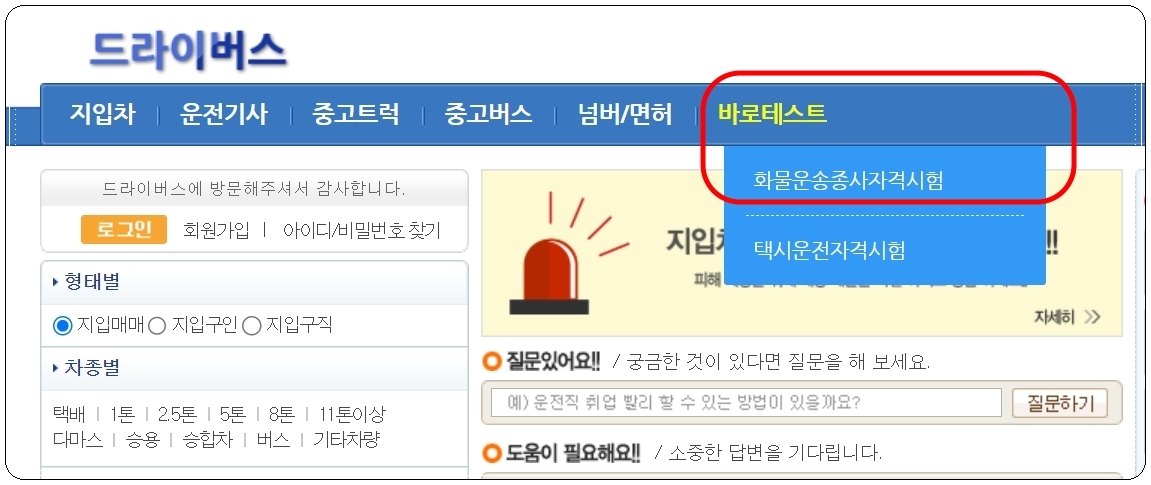 드라이버스 사이트에 접속하면 운전에 관련된 여러 가지 서비스를 만나볼 수 있습니다. 여기에서 화물운송자격증 기출문제에 관련된 메뉴를 선택해야 하는데요. 바로 맨 우측에 있는 "바로테스트"를 선택하면 됩니다.
