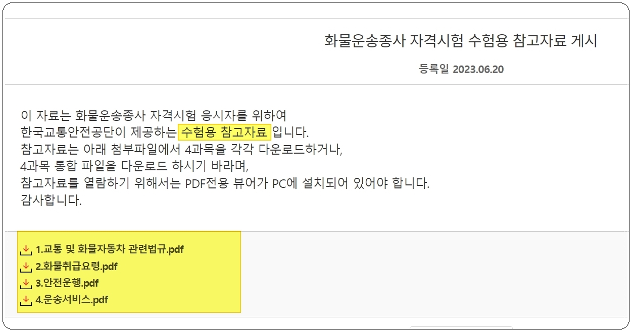 기출문제를 풀기에 앞서 화물운송자격증 시험에 대한 수험용 참고자료를 한 번 정도 읽어보는 것이 좋습니다. 기본서라고 할 수 있는 자료인데요. 교통 및 화물자동차 관련 법규, 화물취급 요령, 운송 서비스, 안전운행 이렇게 4가지 과목에 대한 자료가 있는데요. 제가 아래에 첨부했으니 필요한 분들은 다운 받아 열람해 보시길 바랍니다.