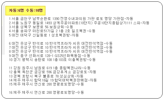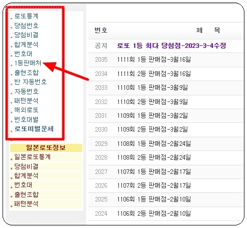 사이트에 접속하여 로또 게시판으로 들어가면 좌측에 여러 가지 소메뉴가 나타나는데요. 여기에서 1등 및 2등 판매점 전체모음 자료도 얻을 수 있습니다. 자동과 수동 중에 얼마나 선택했는지 그리고 어느 지점인지 주소와 함께 알 수 있어서 좋아요.