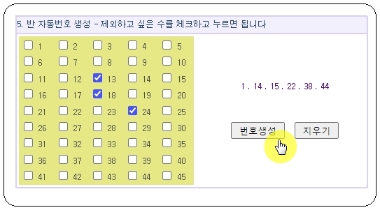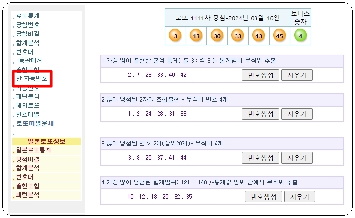 이곳에서 제공하는 통계 자료를 바탕으로 만들어진 로또 생성기 프로그램이 몇 가지 있는데요. 메뉴에서 "반 자동번호"를 눌러보세요. 그럼 5가지 반 자동 생성기를 이용할 수 있습니다. 사용법은 간단해요. 그냥 "번호 생성" 버튼을 누르면 돼요.반 자동 생성기를 사용할 때 제외하고 싶은 숫자를 정하는 것도 가능합니다.