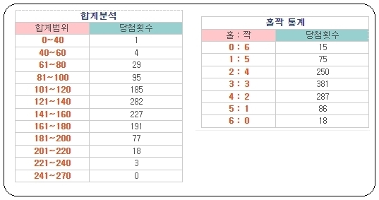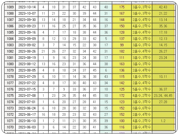 이런 식으로 간단한 표를 통해 전체적으로 로또당첨번호가 어떤 흐름을 보였는지 알 수 있어요. 회차, 추첨일, 당첨번호, 보너스 숫자 외에 번호합계, 홀짝수조합, 연속번호와 같이 통계 자료도 확인할 수 있는데요. 이렇게 한눈에 보면 흐름 파악하기에 용이합니다.
