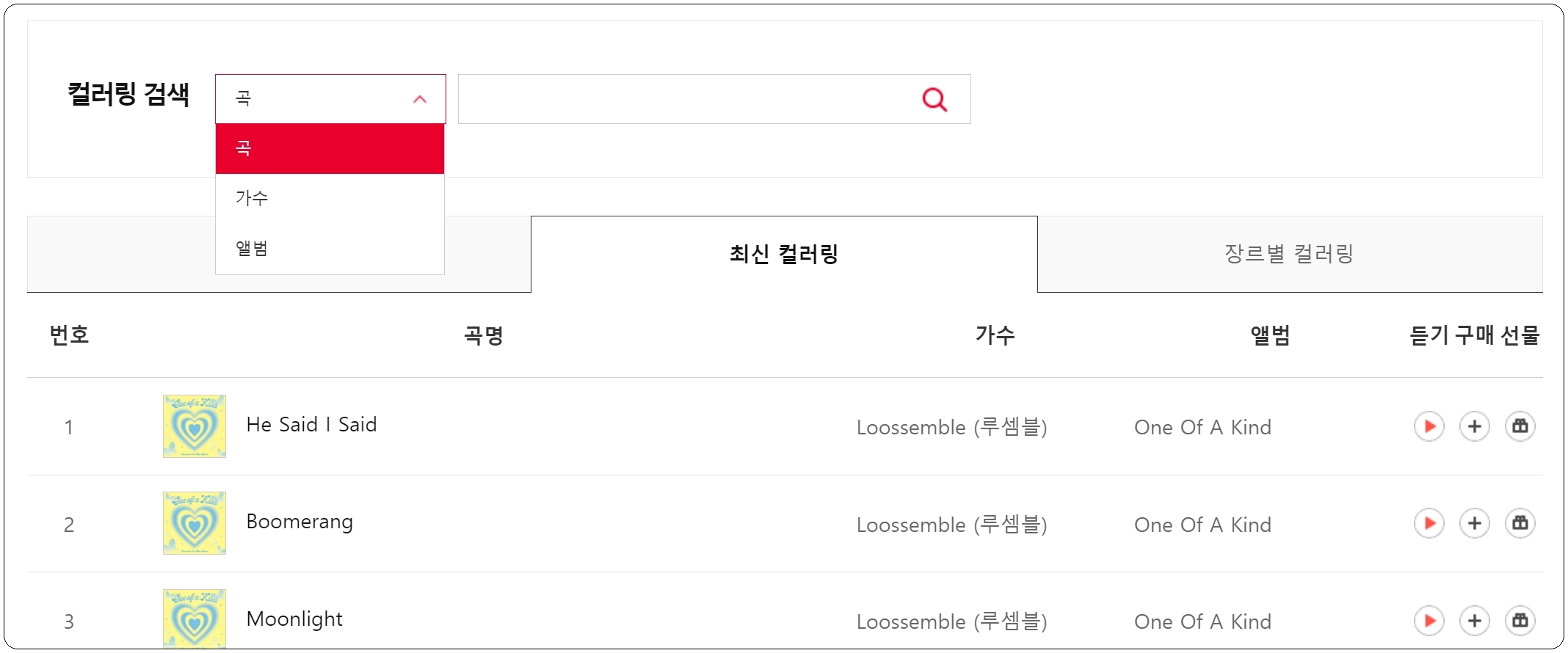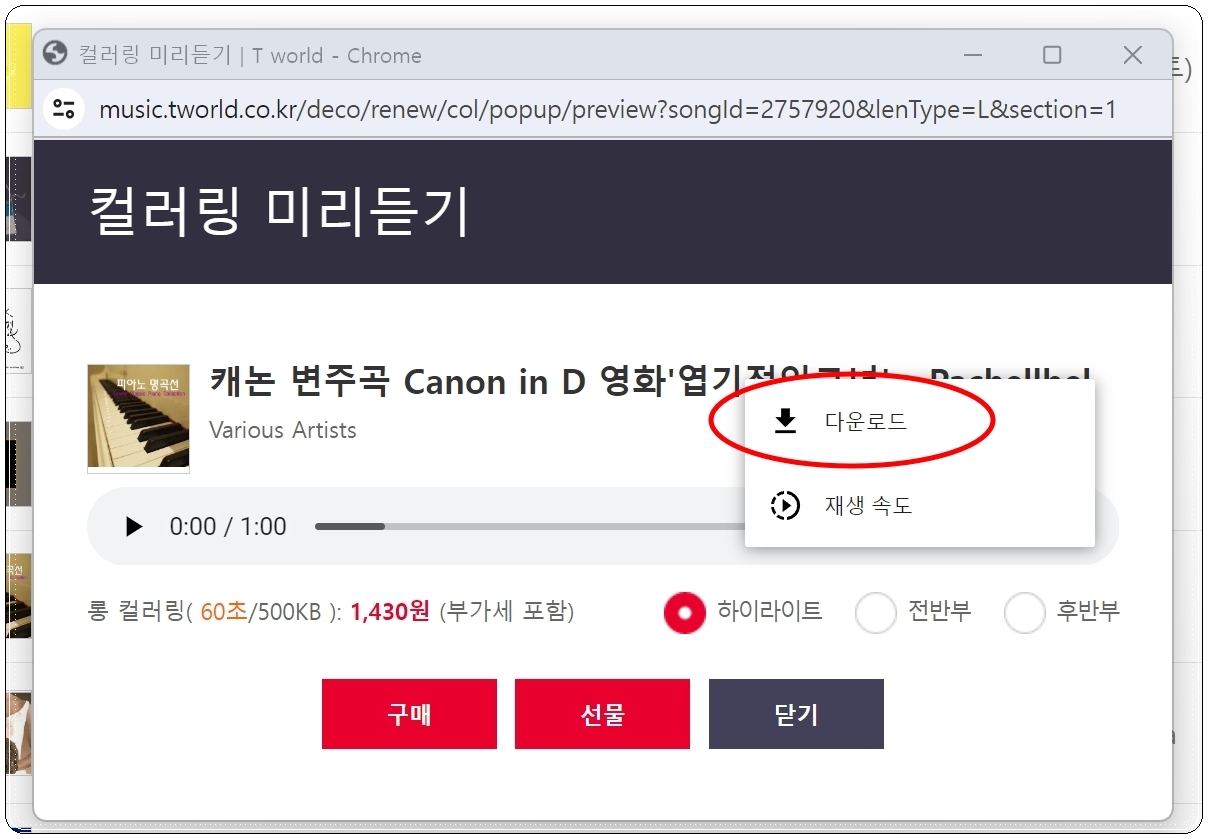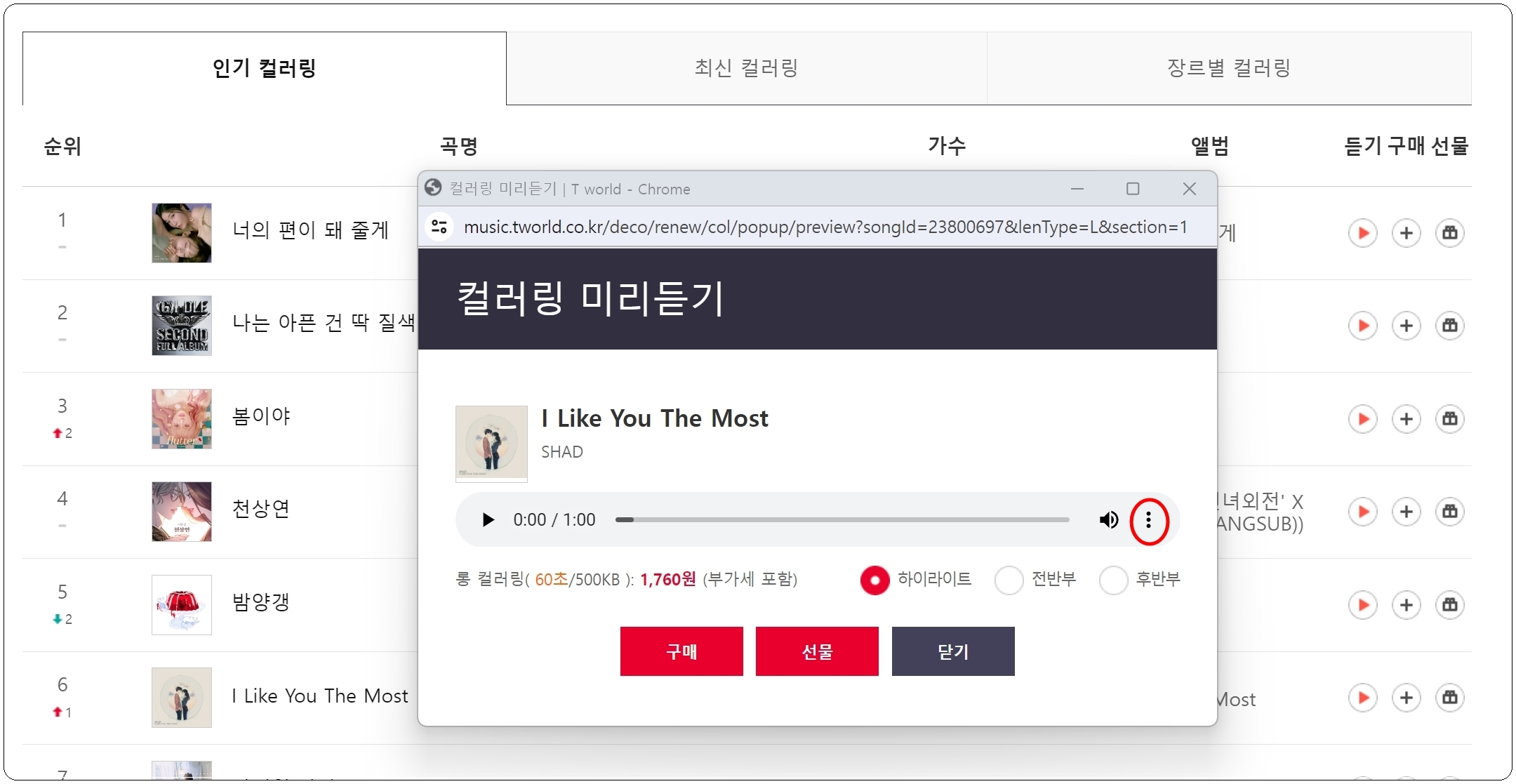 들어보고 싶은 음원이 있다면 리스트에서 재생 버튼을 클릭해 보세요. 그럼 하이라이트, 전반부, 후반부 이렇게 3가지 버전으로 된 음원을 재생할 수 있습니다. 컬러링 요금도 나와 있는데요. 구매 버튼을 누르면 해당 음원을 통화연결음으로 변경할 수 있습니다.