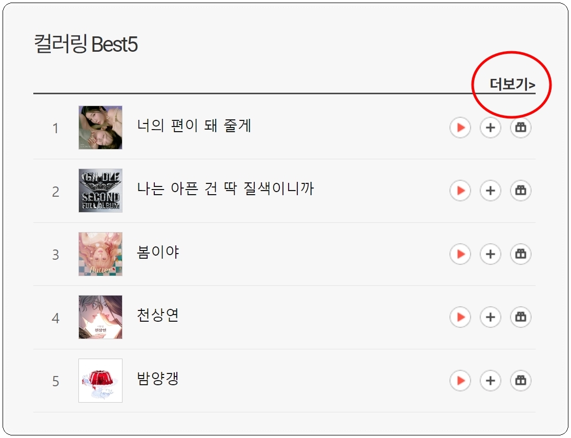컬러링 전용 페이지가 열리면 인기 또는 최신 음원 조회가 가능한데요. 그 아래를 보면 컬러링 Best5가 있습니다. 여기에서 [더보기] 버튼을 누릅니다.