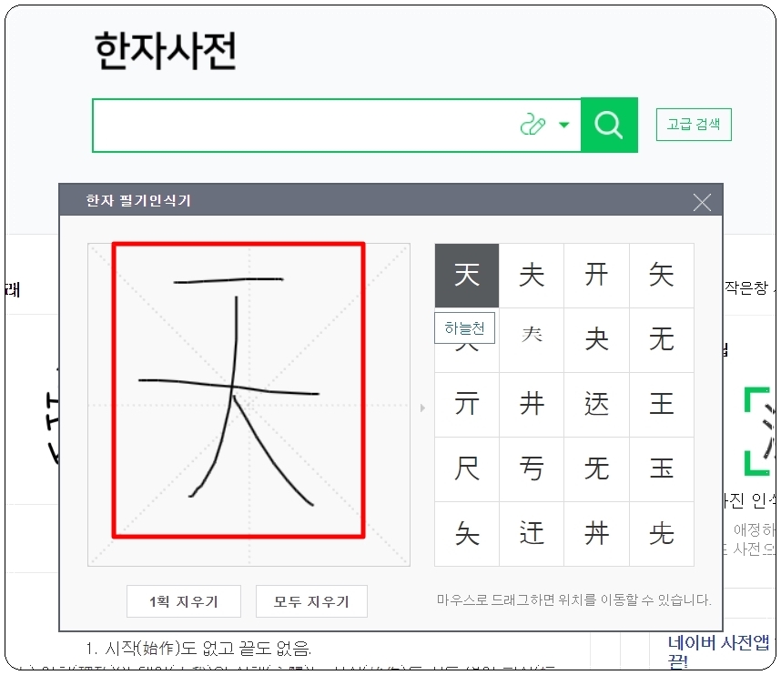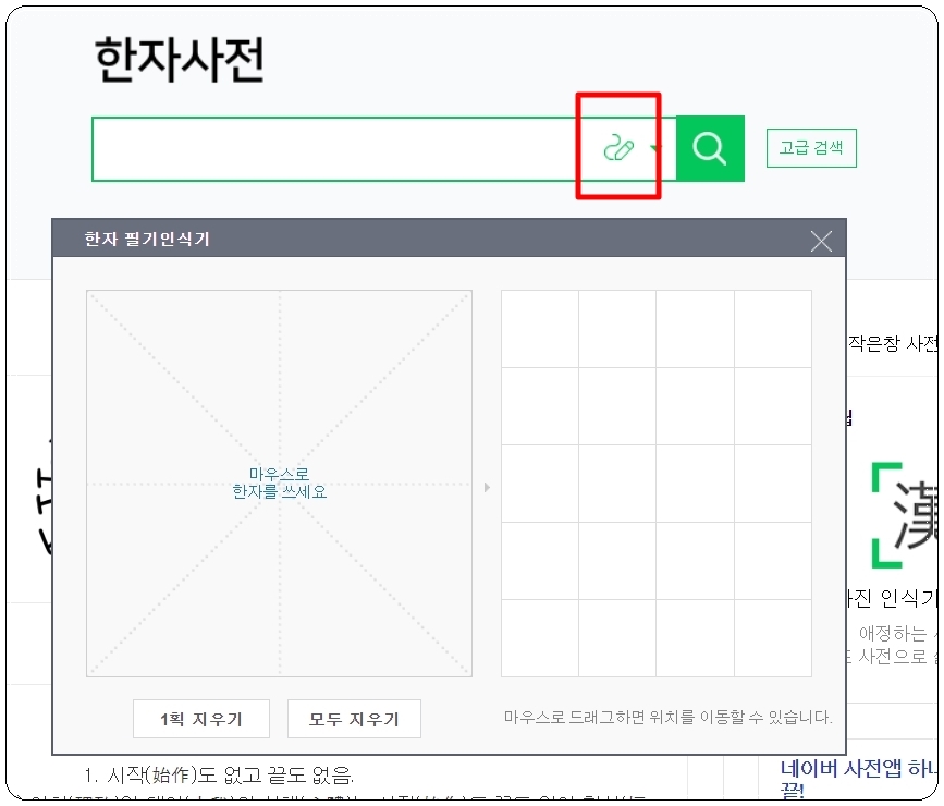 사이트에 접속하면 화면 중앙에 검색창이 나타나는데요. 여기에 있는 필기 모양의 아이콘을 클릭해 보세요. 그럼 필기 인식기 창이 열립니다. 여기에 마우스로 궁금한 한자를 그려 보세요. 그럼 바로 오른편에 우리가 그린 문자와 비슷한 20개의 한자가 나타나는데요. 여기서 선택하면 검색이 가능합니다.