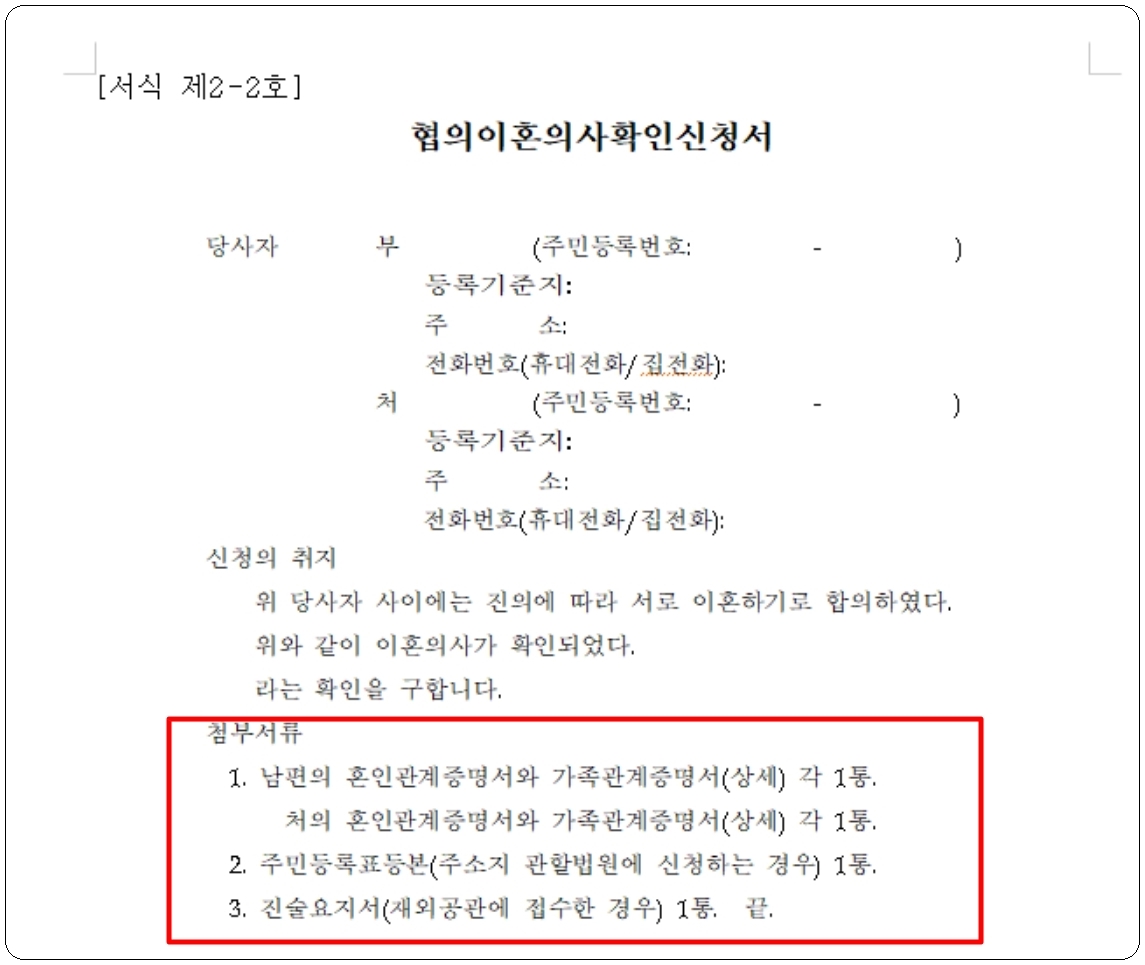 이혼 절차를 진행하기 위해 가정법원을 방문할 때 몇 가지 준비해야 하는 서류와 작성해야 하는 신청서가 있습니다. 일단 가장 기본이 되는 신청서의 경우에는 가정법원에서 바로 작성할 수 있도록 마련되어 있는데요. 방문 전에는 인터넷 상에서 해당 양식을 구할 수 있습니다. 여기에는 준비해야 하는 첨부 서류 리스트가 있는데요. 보통 동사무소, 시청 등에서 발급 받을 수 있는 것입니다.