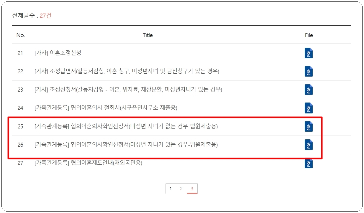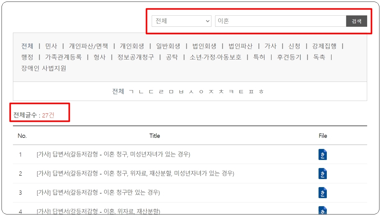 사이트에 져서 가면 중앙 오른편에 있는 양식 찾기 영역에서 "이혼"을 검색해 주세요. 그럼 27건의 이혼 서류 양식이 나타납니다. 여기에는 위자료, 재산분할, 미성년 자녀 등에 관련된 양식이 나타나는데요. 자신에게 해당 사항이 있는 경우만 골라서 사용하시면 됩니다.