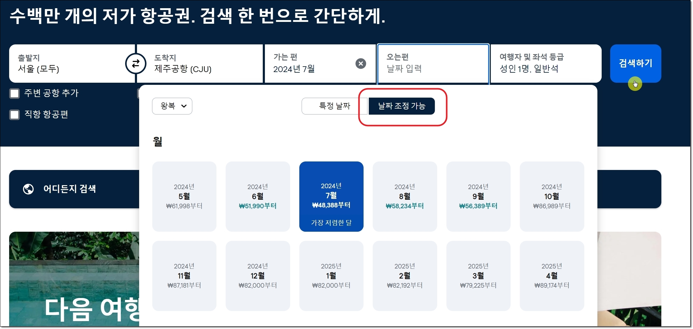 사이트 접속하면 본인이 원하는 비행기표에 관한 내용을 입력해야 합니다. 저는 제주도를 다녀오는 왕복항공권에 대한 정보를 입력해 넣었어요. 다 입력했다면 "검색하기" 버튼을 눌러주세요.참고로 날짜 부분에는 월 단위로 지정하는 것이 좋아요. 이렇게 하면 어느 날에 최저가 비행기표가 있는지 알 수 있거든요.