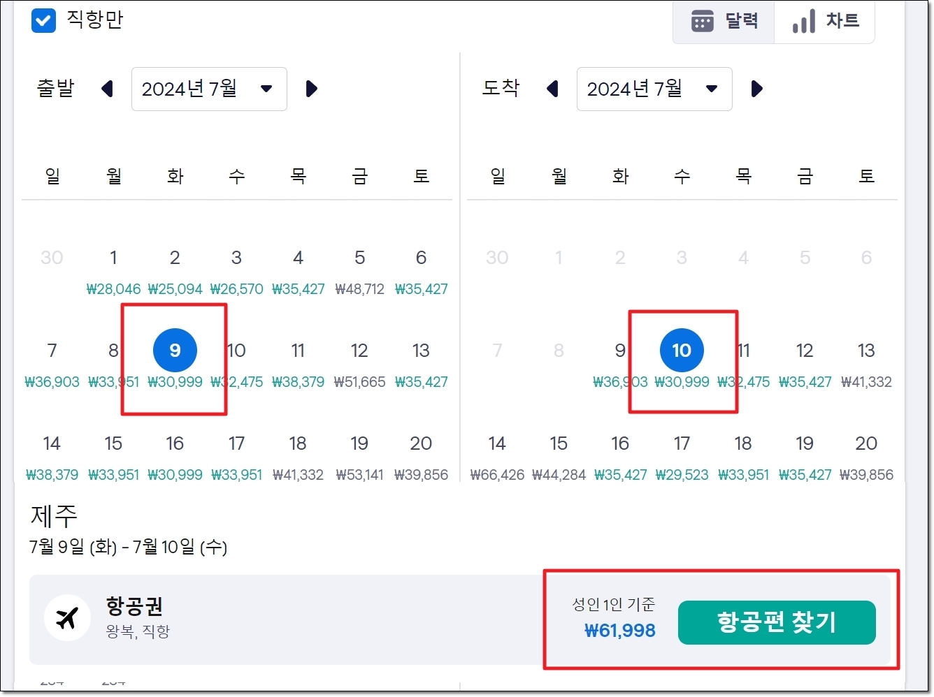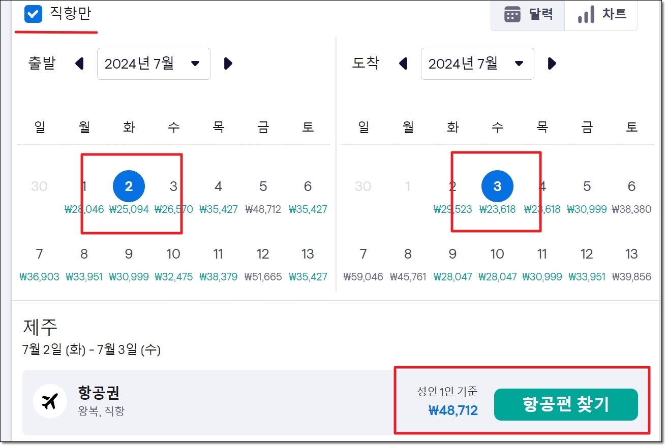 저는 7월 날짜로 선택했습니다. 이에 따라 해당 월에서 각 일마다 최저가 티켓의 가격을 확인할 수 있는데요. 여기 표시된 금액과 본인의 여행 일정을 감안하여 날짜를 정해보세요. 저는 왕복으로 6만원 정도에 제주도를 다녀올 수 있는 왕복항공권을 찾았네요.