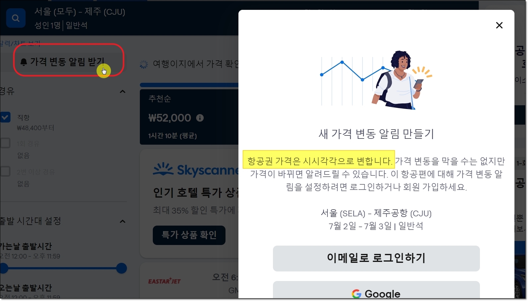 제가 알려드린 방법을 통해 비행기표 예약 사이트를 이용했음에도 불구하고, 저렴한 티켓을 찾지 못했다고요? 그런 경우에는 사이트 좌측 상단에 있는 "가격 변동 알림 받기" 버튼을 눌러보세요. 그럼 저렴하게 나온 비행기표가 나타났을 떄 알림을 받을 수 있어요.