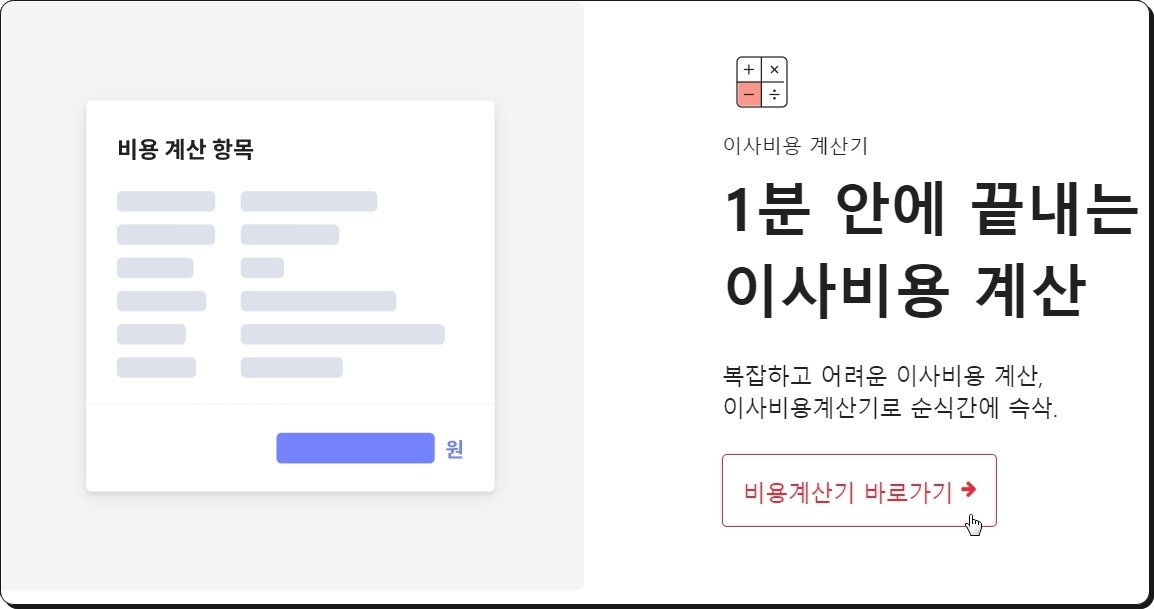 이번 시간에 이용할 견적 시스템인데요. 1분 안에 최종 비용에 대한 계산을 마칠 수 있다고 합니다. 제가 직접 이용해보니 정말 1분 안에 견적을 받아볼 수 있습니다.