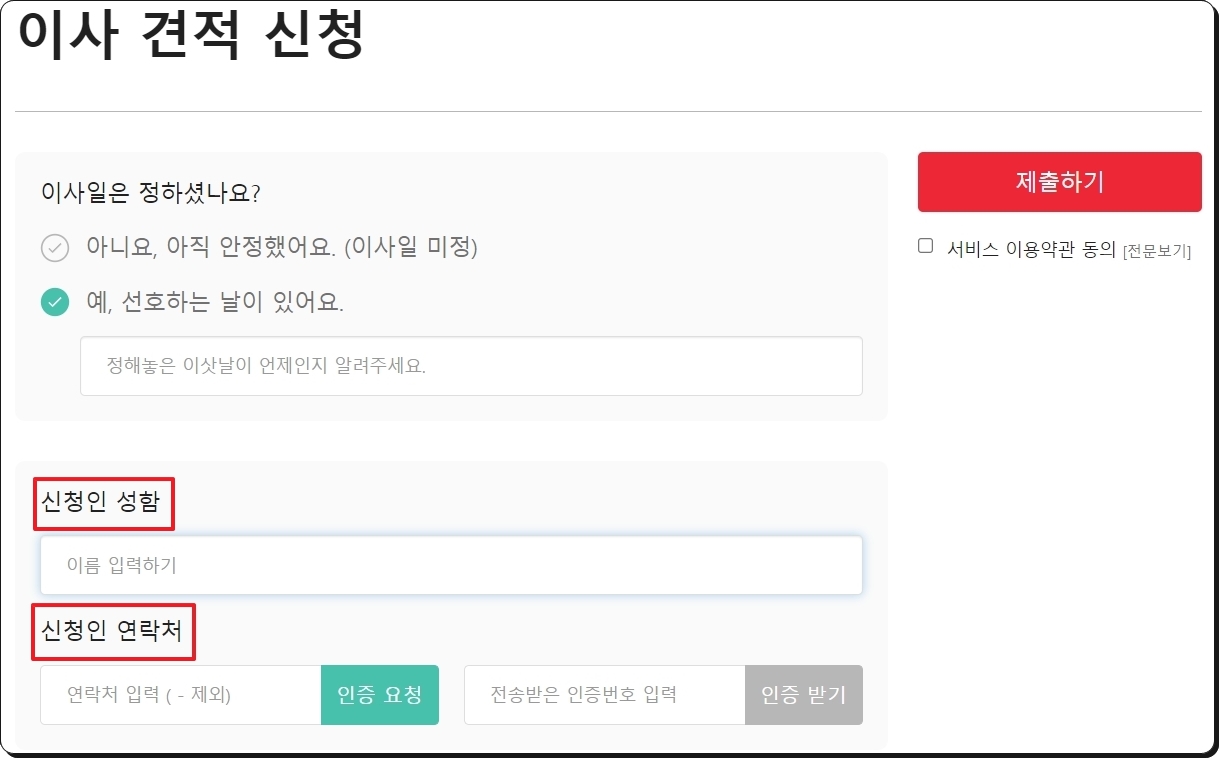 1분 만에 받아보는 온라인 견적에 더하여 실제 견적도 받아볼 수 있는데요. 다음 페이지에 나타나는 견적 신청서를 작성한 후 제출하면 됩니다. 받아보고 싶은 견적의 갯수, 출발지 및 도착지 정보, 이용자 정보 정도만 입력하면 됩니다.