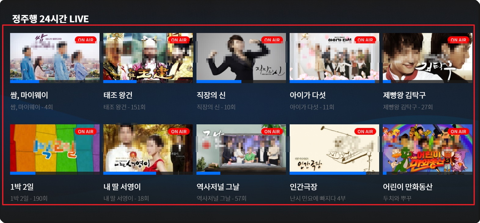 하나의 작품만 계속해서 방영되는 채널도 마련되어 있는데요. 이 또한 온에어 서비스의 일부입니다. 드라마도 좋지만 어린이 만화 동산이나 인간극장, 역사저널 그날과 같은 KBS 유명 프로그램을 만나볼 수 있어서 좋았어요.