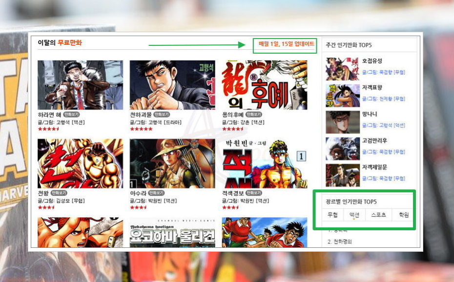 제가 알려드리려고 했던 스포츠서울 무료만화는 완결 작품이에요. '이달의 무료만화'를 보시면 처음부터 끝까지 무료로 볼 수 있는 작품이 여러 개 나와요. 많은 분들이 좋아하는 무협, 액션, 코믹 등 다양한 장르의 작품을 만나볼 수 있어요. 스포츠서울 사이트에서는 매월 1일과 15일마다 업데이트 되기 때문에 주기적으로 새로운 작품을 만나볼 수 있어요.