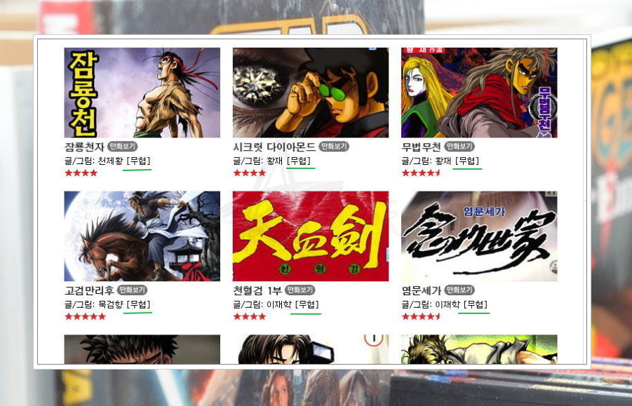 보통 스포츠서울을 이용하는 분들이 많이 찾는 장르는 무협 만화에요. 요즘에는 유명 작가인 천제황, 황재, 이재학, 묵검향의 작품이 업데이트 되었네요. 천혈검, 무협무천, 잠룡천자, 염문세가 등 재미있어 보이는 작품이 많이 보이네요.