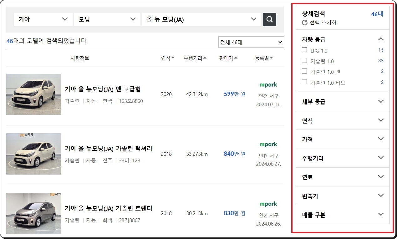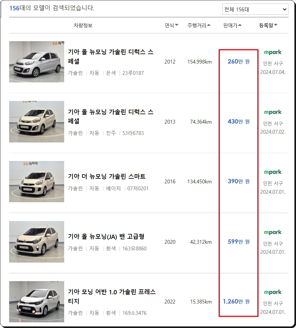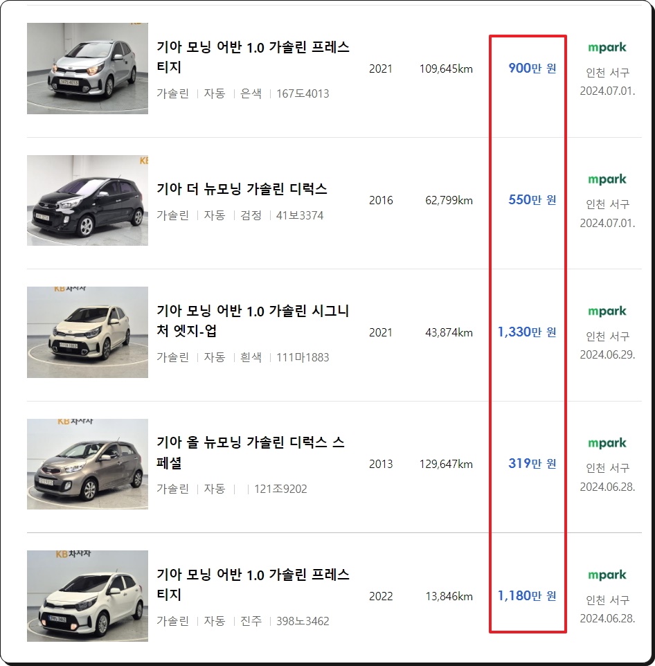 많은 매물을 통한 모닝 중고차 시세 파악하기.