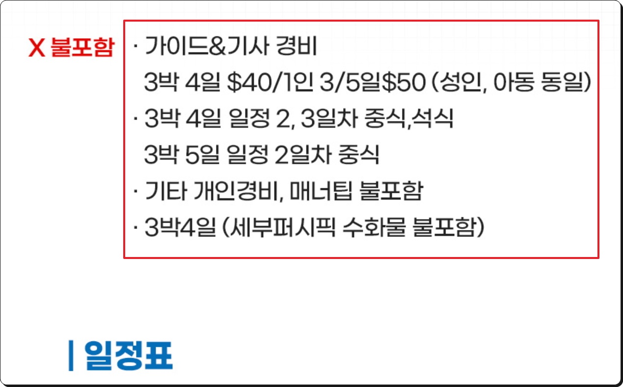 이러한 여행 상품을 이용할 때에는 포함이 되는 서비스와 그렇지 않은 서비스를 꼼꼼히 확인해 보셔야 하는데요. 왕복항공권은 기본이고, 가이트나 관광 서비스, 차량 서비스 등을 포함이 됩니다. 반대로 불포함이 되는 것도 있으니 꼭 확인해 보시길 바랍니다. 긴급모객 땡처리 이벤트를 제대로 이용했다고 생각했는데, 다른 부분에서 비용이 많이 나간다면 특가로 구한 의미가 없기 때문이죠.