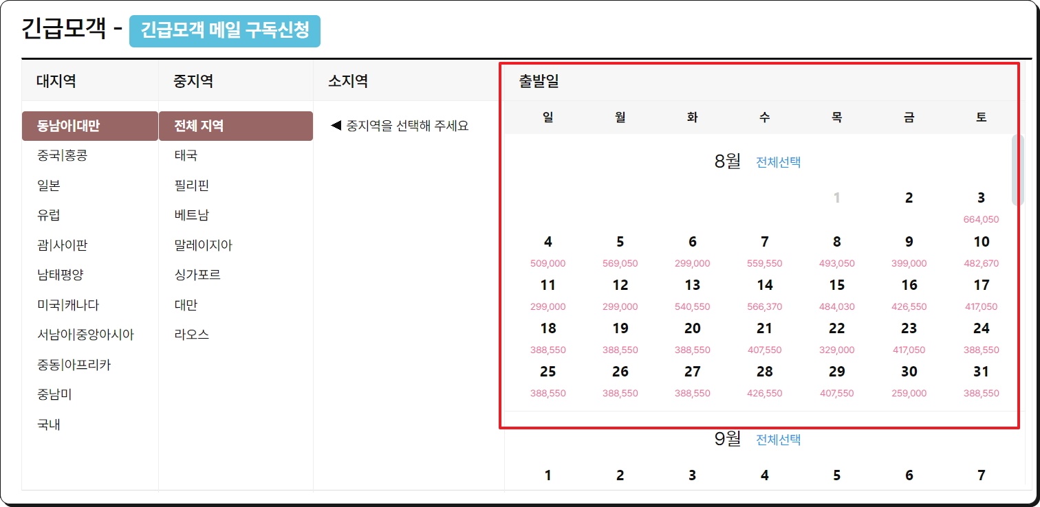 우선 긴급모객 땡처리 여행 상품을 살펴볼 수 있는 페이지를 열어보았습니다. 가고자 하는 지역에 대한 정보와 여행 가능한 날짜를 입력하면 되는데요. 출발일을 선택할 때 보면 여행 상품에 대한 가격이 표시되어 있습니다. 긴급모객 땡처리 여행 상품 중에서도 가장 저렴한 것을 찾으실 때 이러한 가격을 참고하면 좋습니다.