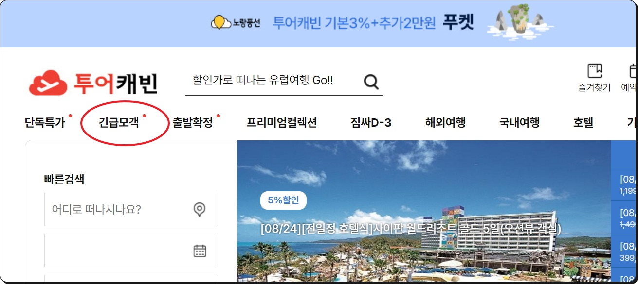 사이트에 접속하면 "긴급모객" 전용 메뉴가 마련되어 있습니다. 이 밖에도 땡처리 수준으로 저렴한 것을 찾으신다면 첫 번째 메뉴인 "단독특가"와 세 번째 메뉴인 "출발확정"을 선택해 보세요. 모두 평소보다 많이 저렴해진 것을 만나볼 수 있는 곳입니다.