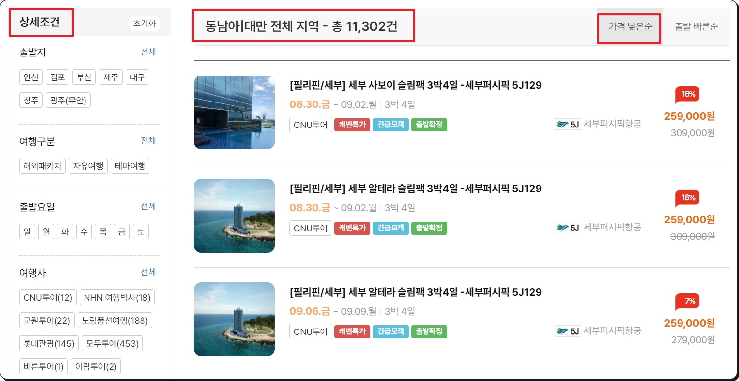 저는 대만 지역을 선택했는데요. 총 11,302건이나 될 정도로 정보가 풍부합니다. 너무 많기 때문에 좌측에 있는 상세조건 기능을 통해 출발지, 여행구분, 출발요일, 업체를 지정해 보세요. 그럼 자신이 원하는 것을 찾기가 수월해 집니다. 여기에 더하여 우측 상단에 있는 정렬 버튼을 이용하면 좋은데요. "가격 낮은순"을 선택하면 이 중에서 가장 저렴한 것 먼저 살펴볼 수 있죠.