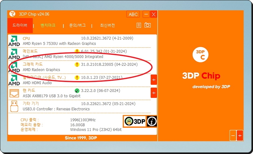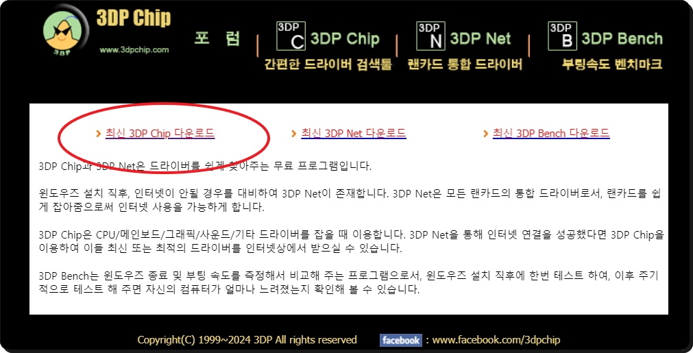 사이트에 접속하면 3가지 프로그램을 다운로드 받을 수 있는데요. 여기에서 가장 첫 번째에 위치한 3dp chip을 선택해 주세요. 가장 최신 버전으로 받는 것이 좋습니다. 보시는 바와 같이 간편한 드라이버 검색툴이라는 표기가 되어 있어요.