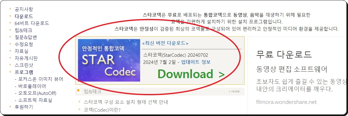 사이트에 접속하면 메인화면 중앙 부분에 최신 버전으로 된 통합코덱 프로그램을 다운로드 받을 수 있는 버튼이 있는데요. 여기에 보면 2024년 7월 2일에 업데이트가 되었다는 것을 알 수 있습니다. 컴퓨터로 동영상이나 음악을 재생을 자주 하는 경우 이용하면 좋은 프로그램이에요.