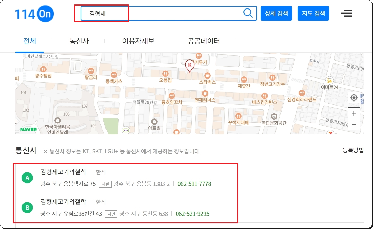 사람 이름으로 검색한 결과입니다. 이런 식으로 사업장에 자신의 이름을 내걸고 운영하는 곳이 있는데요. 이런 경우에 전화번호 찾기를 진행할 수 있습니다. 당연히 가게 위치도 지도로 확인할 수 있어요.