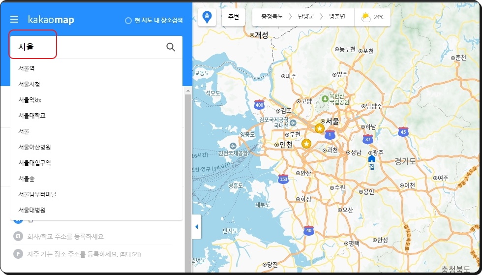 국내 인터넷 서비스는 주로 네이버와 다음에서 만든 것들이 많이 사용됩니다. 지도 서비스의 경우에는 네이버와 카카오 이렇게 두 곳에서 높은 퀄리티의 사이트를 운영하고 있는데요. 개인적으로는 카카오맵을 주로 사용합니다. 크게 차이는 없겠지만, 제가 보기에는 카카오맵이 좀 더 편해요. 카카오맵 사이트에 접속하여 좌측 상단에 서울이라고 키워드를 입력해 보세요.