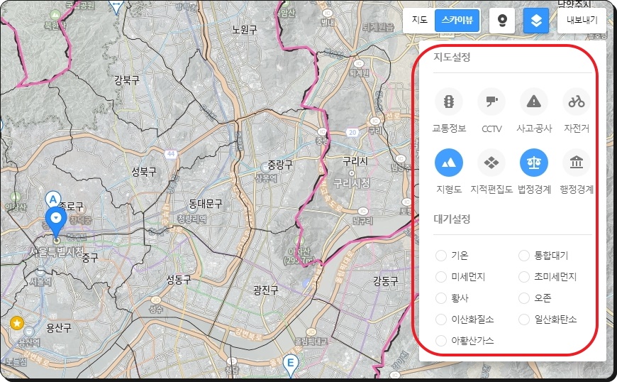 부동산에 관련된 일을 하거나 투자를 하시는 분이라면 지형도나 행정 경계 등을 선택하여 서울 지도를 보는 것도 좋습니다. 직접 하나씩 메뉴를 눌러보면 도움이 되는 것들이 참 많다는 것을 알 수 있어요.
