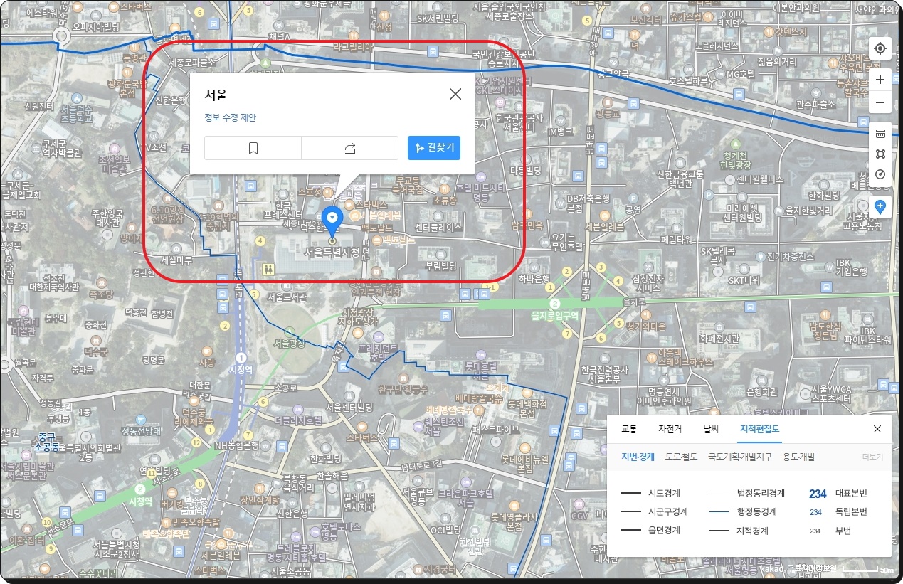 부동산에 관련된 일을 하거나 투자를 하시는 분이라면 지형도나 행정 경계 등을 선택하여 서울 지도를 보는 것도 좋습니다. 직접 하나씩 메뉴를 눌러보면 도움이 되는 것들이 참 많다는 것을 알 수 있어요.