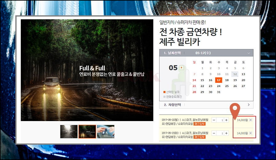 제주도를 여행하는 날짜와 차량을 선택하면 되는데요. 스파크를 기준으로 슈퍼자차를 선택했을 때 일일 14,000원입니다. 저렴한 편인데요. 일반자차를 하면 더 저렴하지만, 렌트카를 이용할 때 완전자차로 하는 것이 좋습니다. 내가 조심한다고 해서 사고나 나지 않으란 법도 없고, 문제가 생기면 제주도 여행까지 망칠 수 있기 때문입니다.