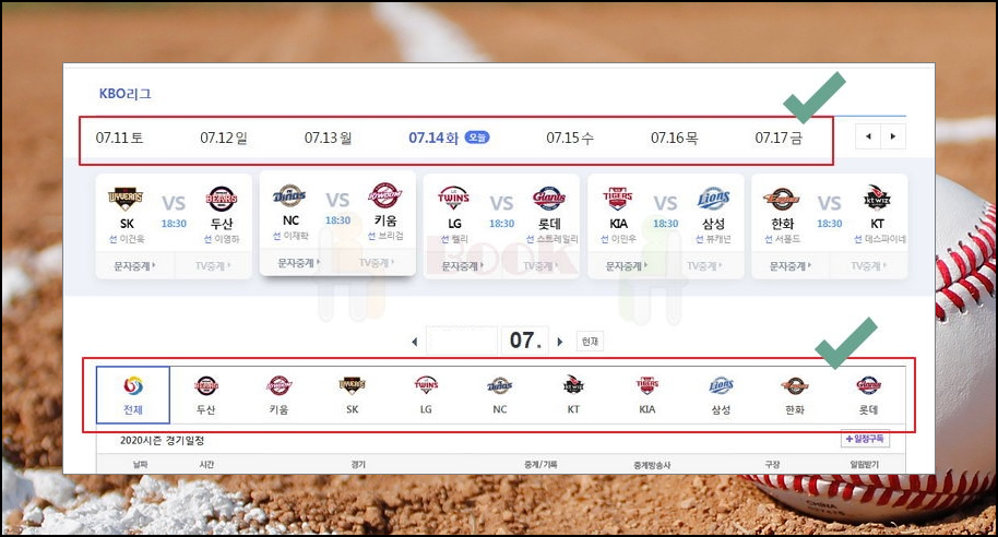 일정 페이지가 열렸어요. 보시면 각 날짜에 경기가 있는 프로야구팀을 확인할 수 있어요. 특정 팀의 경기를 감상하고 싶을 때에는 그 팀을 선택해 보세요. 두산, 키움, LG, SK, KT, NC, KIA, 삼성, 한화, 롯데를 선택할 수 있게 되어 있는데요. 해당 팀을 선택하면 TV중계 또는 문자중계 버튼이 있어요. 해당 버튼을 누르면 바로 방송보기 가능해요. 물론 시간이 맞아야 해요.