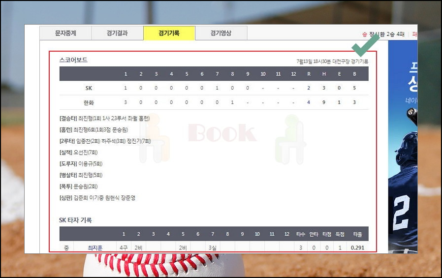 네이버 스포츠 사이트에서 여러 가지 경기기록을 살펴볼 수 있어요. 스코어보드, 타자 기록 등이 있는데요. 정리가 잘되어 있기 때문에 쉽게 파악할 수 있어요.