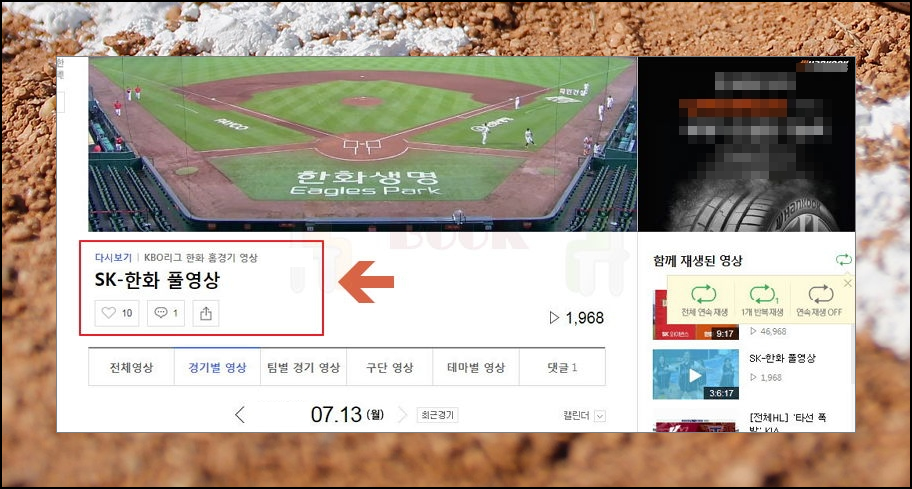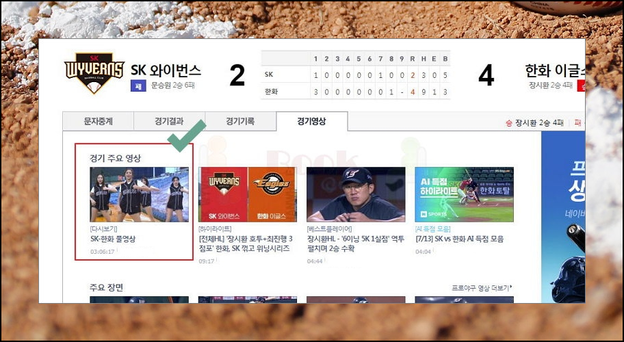 SK와 한화의 프로야구 경기를 풀영상으로 감상해 보았어요. 바로 시청할 수 있는 플레이어가 나타나는데요. 재생 버튼을 누르면 영상이 진행이 돼요.