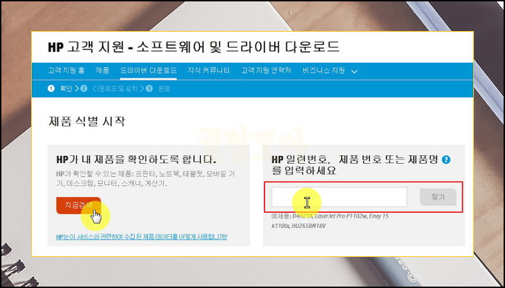 현재 가지고 있는 HP 프린터에 맞는 드라이버를 찾는 방법은 2가지가 있습니다. 왼쪽에 있는 'HP가 내 제품을 확인하도록 합니다."에서 "지금검색" 버튼을 누르거나 오른쪽에 있는 검색창에 일련번호, 제품 번호 또는 제품명을 입력하는 것입니다.