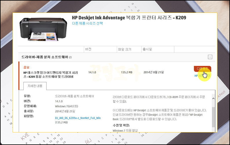 제가 찾던 드라이버가 나타났습니다. HP Deskjet Ink Advantage 복합기 프린터 인데요. 아래에는 유형, 버전, 운영체제, 출시일, 파일명 등의 상세한 내용과 함께 설치 파일을 다운로드 받을 수 있는 버튼이 마련되어 있습니다.