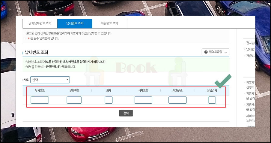 납세번호로도 내역 열람이 가능한데요. 시도, 부서코드, 부과연도, 회계, 제목코드, 부과번호, 분납순서를 입력한 후 검색 버튼을 클릭해 보세요.