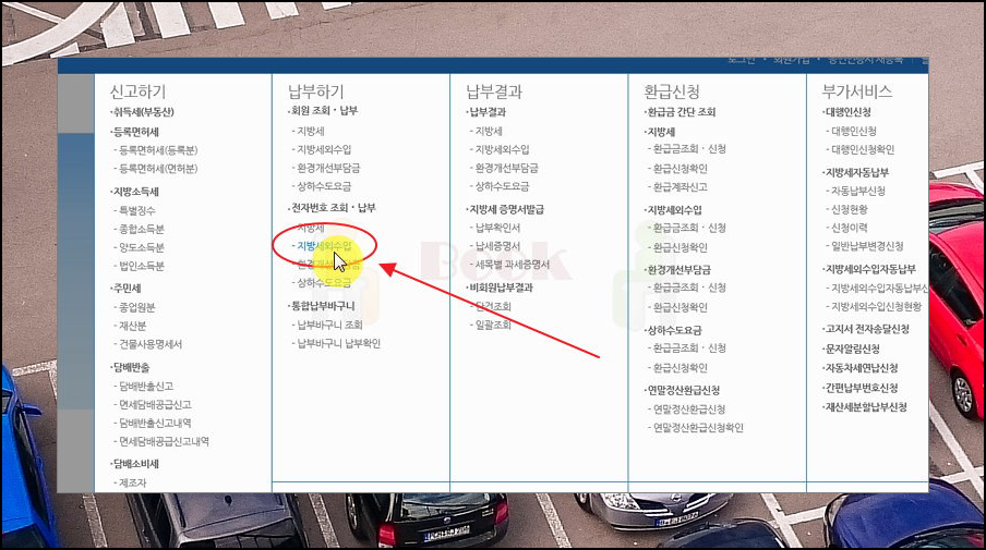 전체 메뉴를 보면 지방소득세, 취득세, 등록면허세, 주민세, 담배소비세 등 여러 가지 세금이 있는데요. 아무리 찾아보아도 주차위반 과태료에 대한 내용은 없어요. 제가 알려드릴게요. 납부하기 카테고리에 있는 [전자번호 조회 및 납부]에 있는 [지방세외수입]을 클릭해 보세요.