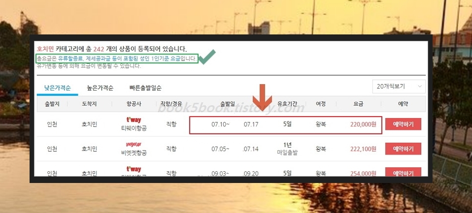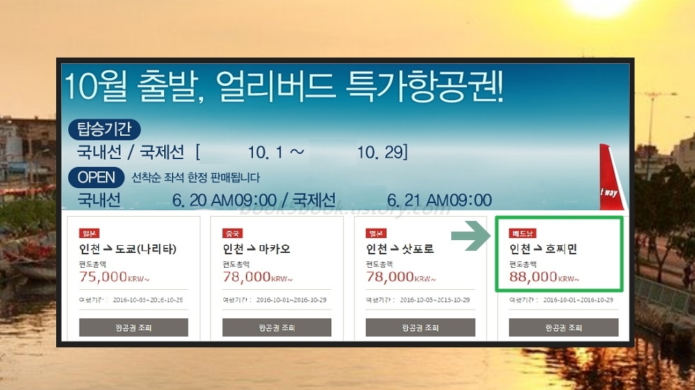 두번째는 땡처리항공권을 이용하는 방법입니다. 출발날짜가 가까워진 남은 좌석을 싼 값에 파는 것을 땡처리라고 하는데요. 각 항공사의 땡처리티켓 정보를 보아서 제공하는 사이트가 있답니다. 여기를 이용하시면 베트남 호치민 자유여행의 비행기값을 좀 줄일 수 있습니다. 하노이에 도착해서 하노이를 보고난 후에 베트남 호치민을 가는 것도 좋겠네요.
