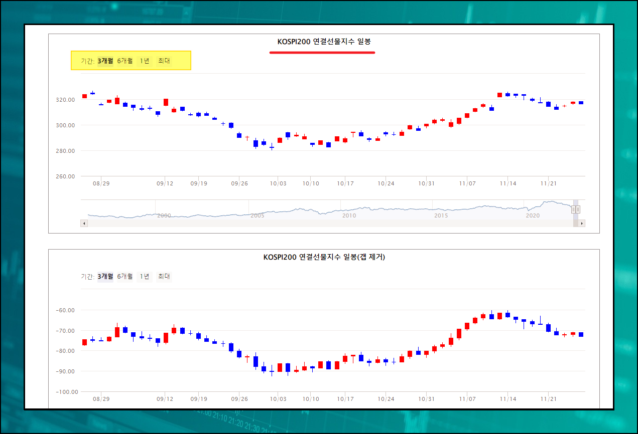 전체적인 흐름을 싶을 때는 코스피00 연결선물지수 그래프 확인해 보세요. 이것은 하루 단위가 아닌 3개월에서 몇 년 간의 흐름을 한눈에 파악할 수 있습니다.