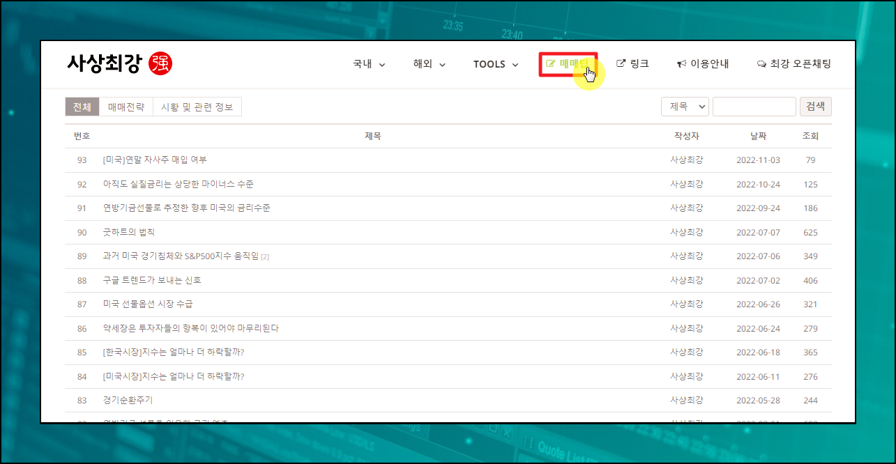 사상최강 사이트에서는 어쩌다 한 번씩 매매 전략과 시황 및 관련 정보가 올라오는데요. 생각보다 퀄리티가 매우 높은 편입니다. 앞서 언급한 서비스와 함께 이용하면 증시 흐름을 파악하는 데에 큰 도움이 될 거에요.